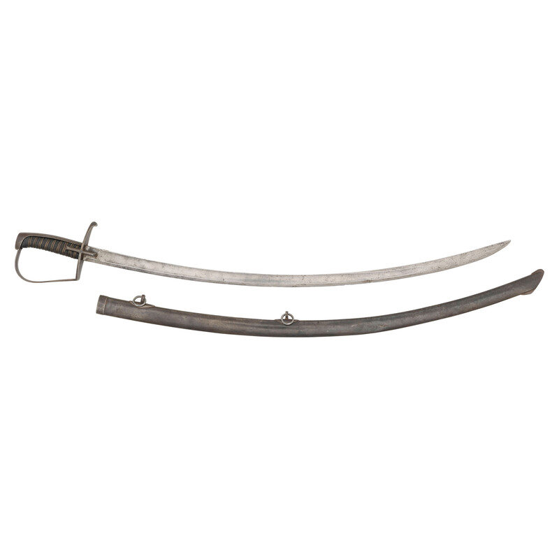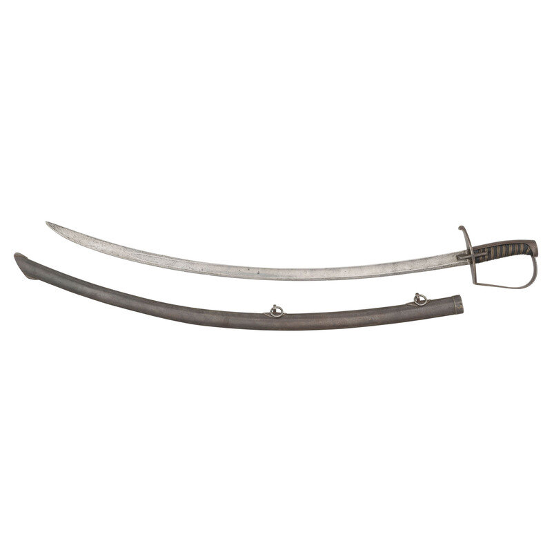 31.25" curved single edged blade with 24.5" stopped median fuller, blade 1.1" wide at ricasso. Overall length 36.25" with a 5" hilt. Reverse-P shaped steel knuckle bow, guard with forward swept quillon, iron backstrap with flat pommel cap. 2.125" langets on either side of guard. Leather covered wood grip with 9 wraps of multi-strand wire. Spine of blade with traces of a script marking that might have been French, Includes a steel scabbard with two suspension rings.