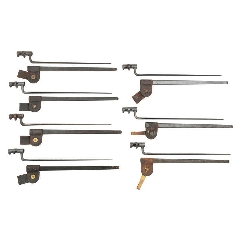 1-4.) Lot of Four Model 1873 bayonets with 3" sockets, 18" blade lengths, 21" overall lengths. All items have a polished blued finish and are struck US. All four mount steel scabbards with pivoting hangers, one with US marked frog, the rest unmarked.