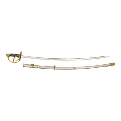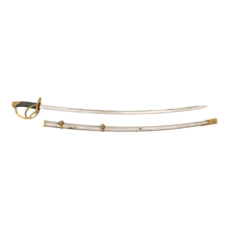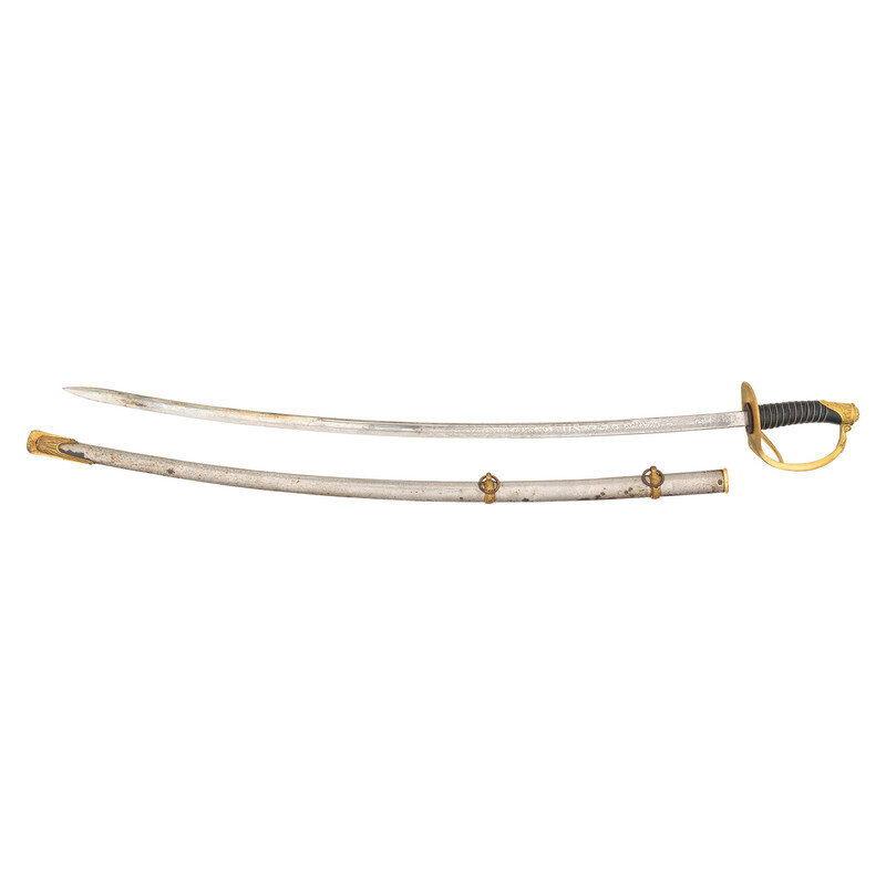 33.75" blade length. 39.5" with hilt. 40.25" with scabbard and hilt. Curved single edge spearpoint blade with etched foliate patterns to the blade enclosing Panoplies of Arms, Spread Winged Eagles, and US initials. Left ricasso is etched with the maker marking U.S./ARMORY/Springfield/Mass. Hilt is composed of gilt brass with triple branch guard socketing into the Phrygian helmet pommel, and fastened by a peened tang. Interior guard cast with an {Eagle} above the grip and thirteen stars arrayed around the lower guard. Backstrap shows a US Army {Shield} seal above olive branches and a beaded ground. Comes with a nickel plated scabbard with double mounting rings and gilded brass fittings.