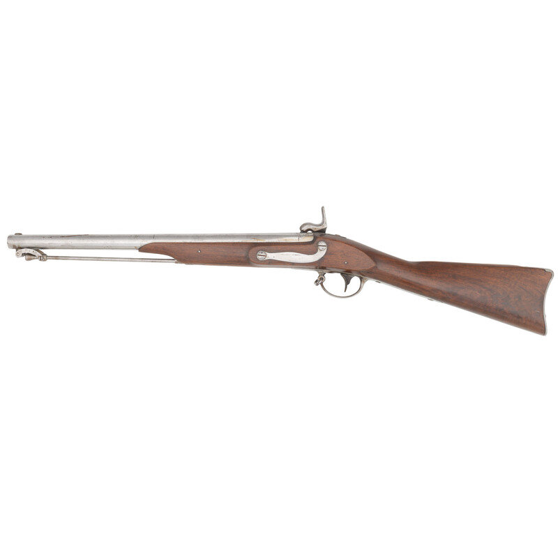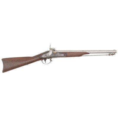 .69 Caliber. 18.75" pinned smoothbore barrel. NSN. Bright finish, walnut stock. Smoothbore percussion altered muzzleloading military musket, altered to musketoon. Harpers Ferry marked lock dated 1838. Barrel tang with modern applied 1838 date. Breech with NWP/P inspection marks, indicating it is from a contract rather than arsenal made 1816/22/28 musket. Modifications include shortening the barrel, removing the barrel bands and securing the barrel with a pin, adding a front sight blade, adding a swivel ramrod, shortening the stock so the length of pull is now only 12", adding an 1855/1861 style buttplate instead of the original musket buttplate and replacing the sling swivel in the triggerguard. The assembly matching number "6" or "9" is stamped on the side plate and on both arms of the swivel ramrod. The exact purpose of the alteration is not clear, as the gun is now a sort of hybrid between a US M1847 Musketoon and a US M1855 Carbine. The modifications were likely performed in the 20th century rather than the 19th century. {ANTIQUE}