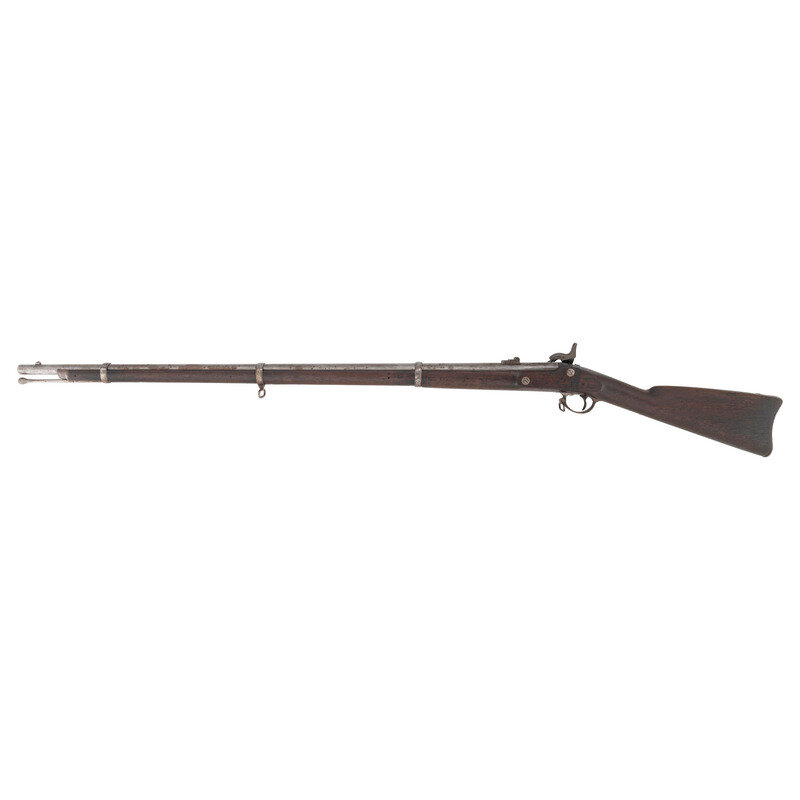 .58 caliber. 40" barrel. NSN. Bright finish, iron furniture, full-length walnut musket stock. Single shot percussion ignition muzzleloading rifle musket with three solid, rounded, spring-retained barrel bands, M1861 pattern rear sight, combination rifle musket front sight and socket bayonet lug, sling swivels. 1864 dated Springfield lock, breech date illegible, weak V/P/{Eagle Head} on breech. Two mostly legible script cartouches on counterpane, including a correct ESA. Includes a straight shank tulip head ramrod. {ANTIQUE}