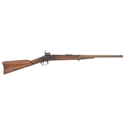 .58" caliber. 25.3" barrel length. SN: NSN. Deep brown patina overall with a cut down barrel retained by a single U marked barrel band and set in a walnut straight wrist stock with half length handguard. Single shot muzzle loading percussion rifle mounting a dovetailed brass front blade and a rear notch sight cut into the sight base. Stock is further decorated with triple brass tacks to each flank of the forend and butt. Receiver retains the 1864 date, but the arsenal mark over the lock has been obliterated. Upper left barrel flat retains visible V/P/{Eagle Head} marks. Lacks ramrod. {ANTIQUE}