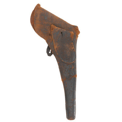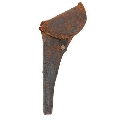 11.5" holster body, diagonally 16" from tip to farthest part of holster flap with flap closed. Sized to fit a Colt 1860 Army revolver. One piece body and flap construction with seam sewn along the lower edge of the barrel portion of the holster. 2.5" wide by 4.5" tall belt loop on rear of holster to accommodate up to a 4" belt is sewn without rivet reinforcements. A large brass stud on the face of the holster is intended to engage the closure flap. Leather decorated with embossed edge lines around the flap and belt loop and a soldier added decorative hex-style flower of life symbol of the face of the flap. The holster appears to be a civilian made copy of a US military holster and may be of southern origin.