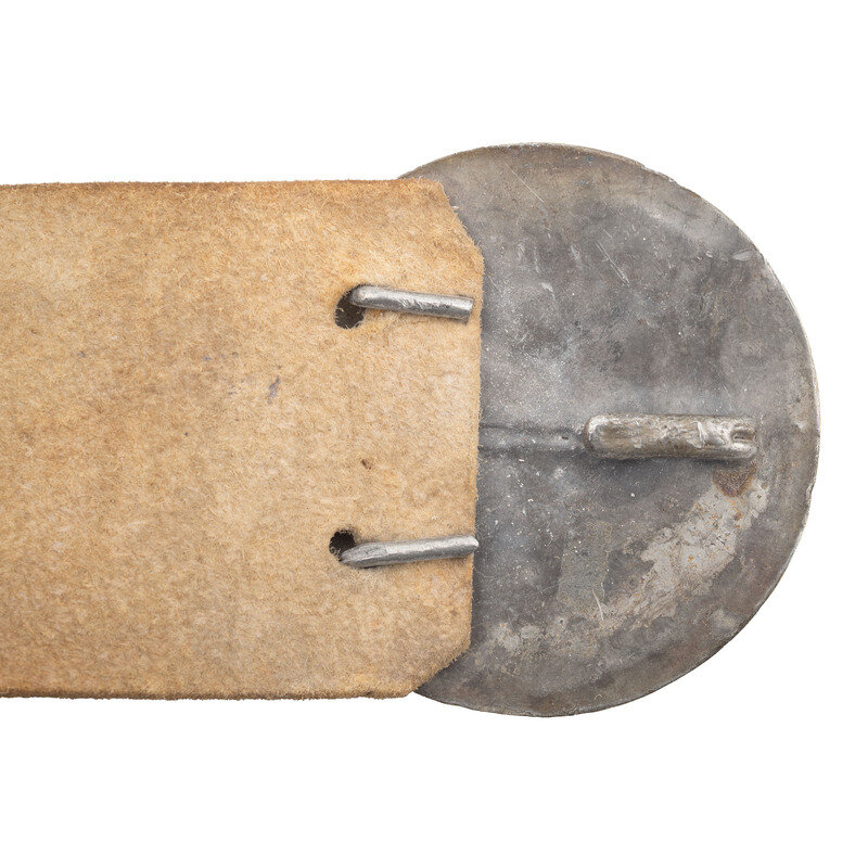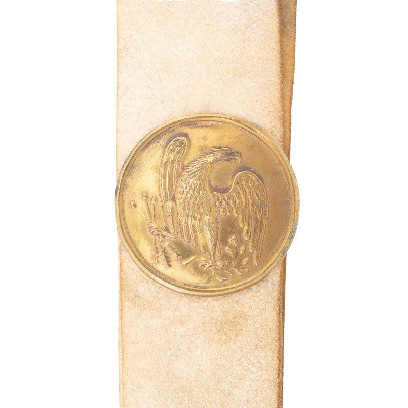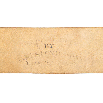 Nominally 58" in overall length, 2.15" wide and .13" thick. Made of undyed buff leather, whitened with chalk. Sewn, angled frog at the junction of the two ends of the leather to accommodate the frog hook on the throat of a US M1840 NCO Sword, or alternatively any similar scabbard with frog hook like that of an M1840 Musician's Sword. Baldric includes a standing loop on one end to secure the opposing end of the belt and three holes for length adjustment as well as two holes accept the hooks of the 3-hook NCO breast plate. Includes a reproduction NCO eagle breast plate for display. A partly visible but mostly illegible makers stamp is on the inside of the baldric which appears to read: MANUFACTURED/BY/JAMES BOYD & SONS/BOSTON, MASS. The firm of James Boyd (& Sons from about 1839 onward) was a Boston based saddlery firm that was in operation circa 1818-1885. One of their earliest contracts to provide US military accoutrements was from 1845 for 5,000 sets of infantry accoutrements, 1,000 sets of cavalry accoutrements, 120 single frog NCO shoulder belts (like the one offered here) and 25 double frog NCO shoulder belts that would accommodate a bayonet scabbard as well as the sword scabbard. The firm delivered another 9,000 sets of infantry accoutrements during the Civil War, from two different contracts dated October 1862 and November 1863. If the listings in Bazelon's American Military Goods Dealers & Makers are complete and all inclusive, it suggests that Boyd may have only produced 120 of these single frog NCO shoulder belts, making it a very rare, pre-Civil War accoutrement.