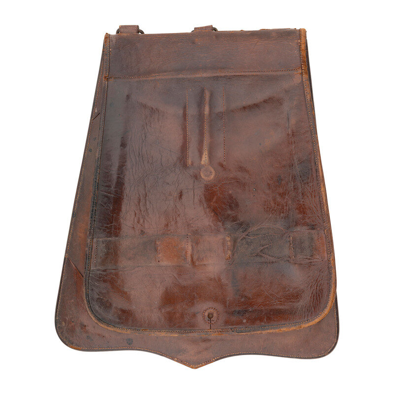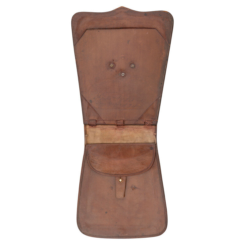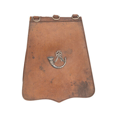 Nominally 11" long by 10" wide at the widest point, roughly trapezoidal in shape with scalloped bottom edge. Three suspension rings are present along the top edge. An infantry hunting horn is attached to the face of the pouch. Marked H.E. Harbin Maj./2nd V.B. Somtt. Lt. Infty. in period ink on the inside. An image that is supposedly Harbin is inside one of the inner pockets and is signed on the back WM Crockett/3 Cleveland St/Taunton. Hand written notes that accompany the photo on a separate sheet indicate that the image which shows Harbin in full uniform and with a sabretache was a captain and instructor of musketry when the image was taken in July of 1881. At that time Harbin was in the 1st Battalion Somersetshire Light Infantry. Research in the British Army Lists indicate that Harbin was made a captain in the 3rd battalion of the Somersetshire Light Infantry on March 26, 1873. Additional research indicates that Harbin was then promoted to Major as of August 18, 1880 in the 2nd battalion, suggesting that some of the accompanying notes may not be quite accurate. The Army Lists indicate that he became the 2nd battalion's Lt. Colonel on January 22, 1887. Additional notes indicate that on June 12, 1892 he was awarded the "V.D." (Volunteer Officer's Decoration) as Lt. Colonel of the 2nd Volunteer Battalion of the Somersetshire Light Infantry. The 2nd Battalion of the Somerset Light Infantry was raised in 1858. It saw service during the Third Burmese War (1885-1887) and the Boer War of 1899-1902, including fighting at the Relief of Ladysmith. During WWI the 2nd battalion saw service in India. Further research regarding Harbin and his service could prove fruitful.