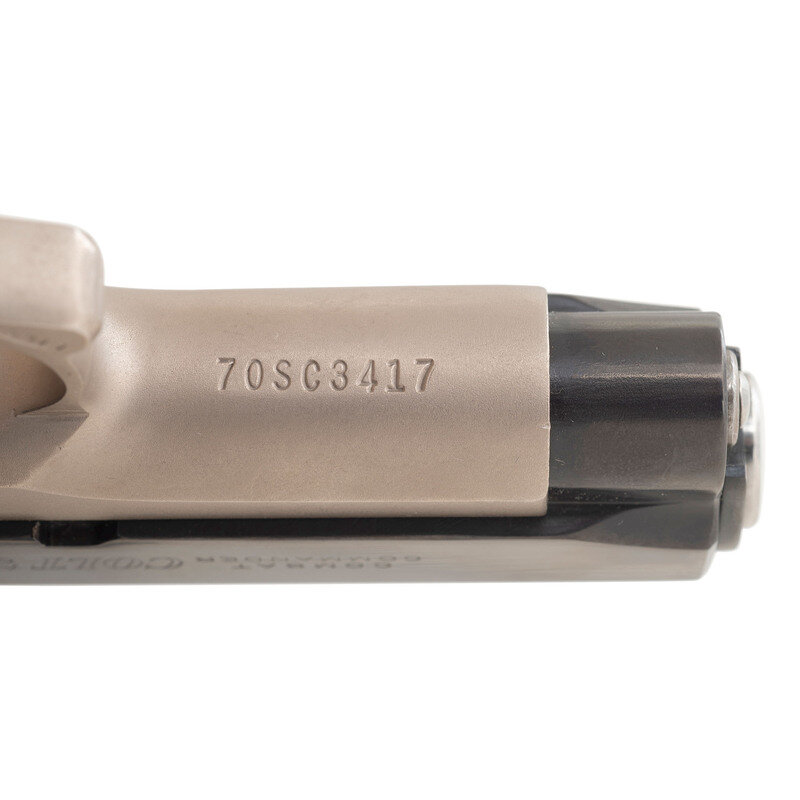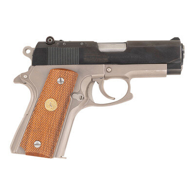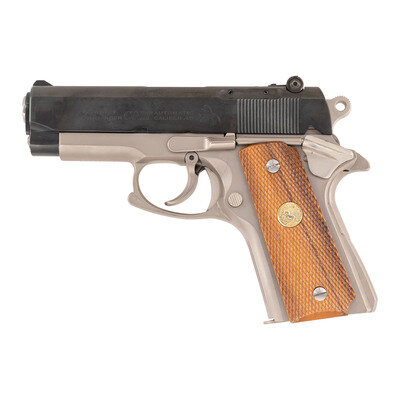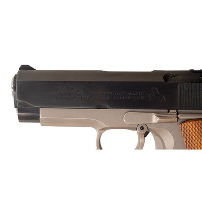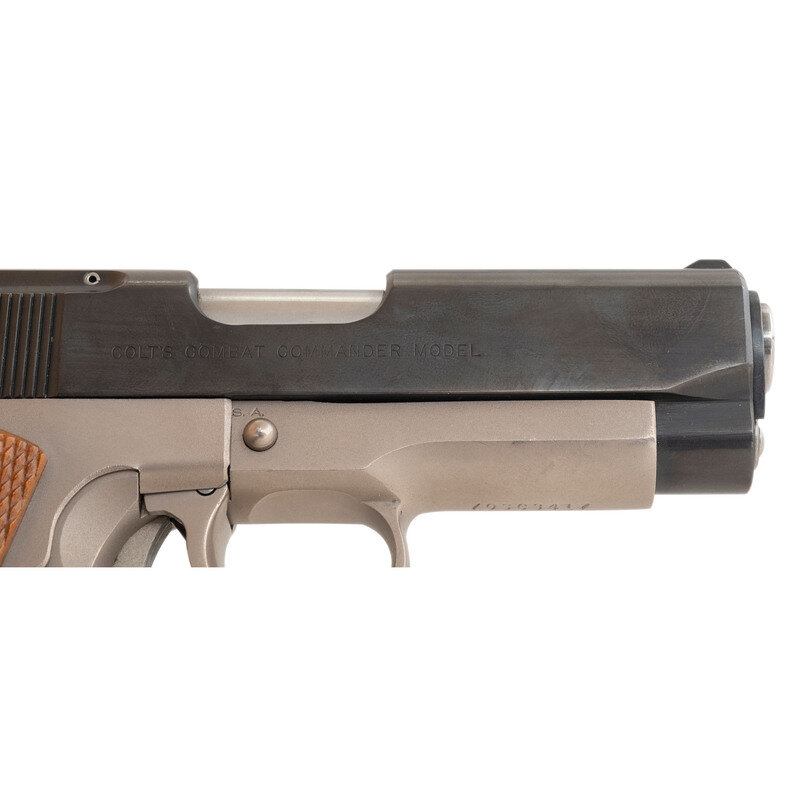 .45 ACP. 3.7" barrel length. SN: 70SC3417. Satin nickel finish to frame with blued slide mounting checkered Colt medallion grips with adjustable rear notch and front blade sights. Short recoil operated DA/SA autoloading pistol fed by detachable single stack magazines featuring customization by LW Seecamp. Frame and slide are cut down to Officer's Model size. Standard Colt Combat Commander markings overall with single line address to right frame hidden by conversion plate for trigger. Top of the slide and left triggerguard shows the LWS marking. Custom features include: one piece backstrap with no grip safety, vertically serrated forward gripstrap, dual recoil springs, and matted top slide. {MODERN}