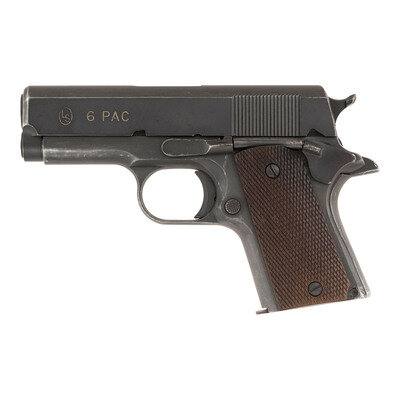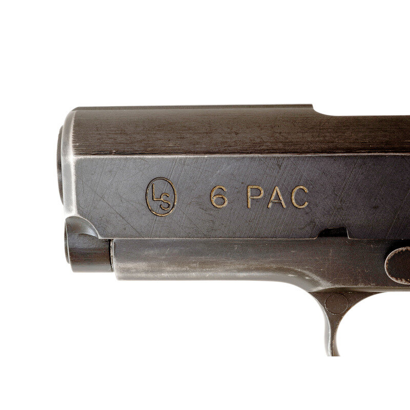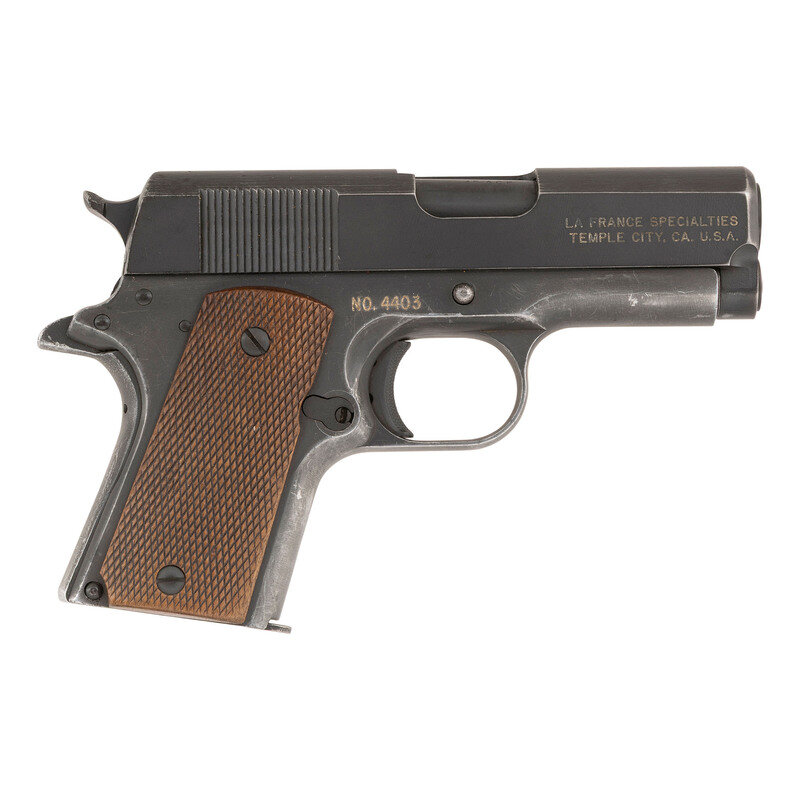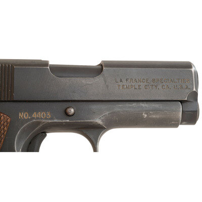 .45 ACP. 3.375" barrel length. SN: 4403. Parkerized metal finish overall with checkered walnut grips, gutter sights, and a cut down 1911 pattern wide hammer. Short recoil operated single action autoloading pistol fed by detachable magazines. Item features a bushingless bull barrel, full length guide rod, and a smooth mainspring housing without grip safety mechanism. Pistol features the straight pull trigger and separate backstrap indicating that a 1911 pattern pistol served as the parent gun. Right slide shows two-line maker mark reading LA FRANCE SPECIALTIES/TEMPLE CITY, CA. U.S.A. with the left displaying LS 6 PAC model marking. {Modern}