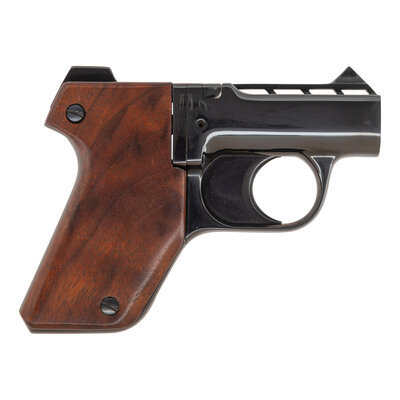 .22LR. 2.5" barrels. SN: 2925. Blued finish, smooth hardwood grips. Four barrel, tilt down, double action only derringer with rotating firing pin, of the style used by Sharps in the mid-19th century. Action opens by depressing the rear sight which is attached to a T-shaped barrel catch. Front sight is a fixed blade. A sliding safety is present on the upper left of the frame which automatically engages when the action is closed. {MODERN}