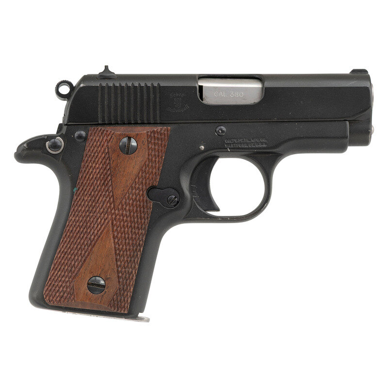 .380 ACP. 2.75" barrel length. SN: PL57126. Matte black Cerakote metal finish with polished barrel and mounting diamond checkered walnut grips. Short-recoil operated single action autoloading pistol fed by detachable single stack magazines. Item mounts low-profile military style sights with all edges rounded in full-melt job performed by Scott, McDougall & Associates. {Rampant Lion} mark of Scott, McDougall appears on right slide with standard make and model markings elsewhere. Item features a beveled magazine well, and one piece slide with integrated barrel bushing. {MODERN}