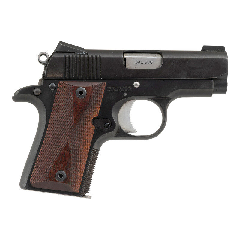 .380 ACP. 2.75" barrel length. SN: MU35972. Polished blued flats and matte rounds with polished barrel, matte trigger and slide stop, and mounting diamond checkered walnut grips. Short recoil operated single action autoloading pistol fed by detachable single stack magazines. Item features a steel frame, extended safety lever, Novak style sights with Tritium inserts, smooth trigger, beveled magazine well, and checkering to the forward gripstrap. Hammer flanks are polished. Rear slide matted. Standard make and model markings overall, including COLT MK IV/SERIES 80/MUSTANG-380 AUTO to the left slide, and two-line Colt address to right frame. Item features solid slide with integrated barrel bushing. {MODERN}