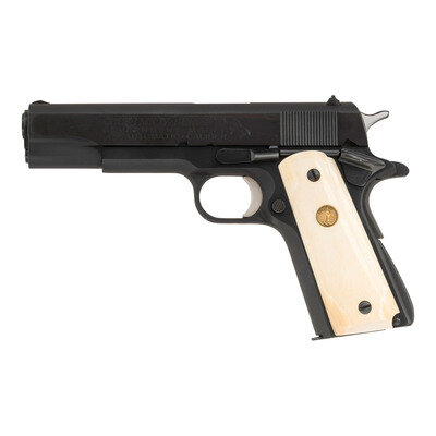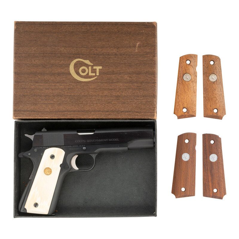 .45 ACP. 5" barrel. SN: 70G20252 (mfg. ca. 1972). Blued finish, matted top of slide, smooth faux ivory Colt medallion grips. Single action Browning design semi-automatic 1911A1 pattern pistol with arched mainspring housing, grip safety, thumb safety, grooved aluminum trigger, dovetailed notch rear sight and serrated front sight. Standard Colt MKIV/SERIES 70 markings. Includes a single 8-round blued Colt marked magazine and two additional sets of wood Colt medallion grips. Pistol is in an original cardboard "wood grain" factory box without end labels and factory paperwork. {C&R}