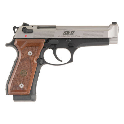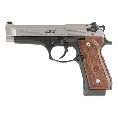 9mm Para. 4.7" barrel length. SN: BER390196. Black Bruniton finish to frame with Matte stainless barrel and slide mounting checkered walnut Beretta medallion grips. Short recoil operated DA/SA autoloading pistol mounting NOVAK'S rear notch and matted front blade sights, ambidexterous safety/decocker, skeletonized hammer, and extended magazine release. Item additionally features front and rear cocking serrations with left slide showing black finish ELITE II markings above BERETTA USA importer marks. Standard make and model markings. Magazine is a single 10-round limited capacity one. {MODERN}