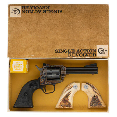 .22LR. 4.375" barrel. SN: G54697 (mfg. ca. 1972). Blued and color casehardened finish, checkered plastic Rampant Colt logo grips. Single action revolver with loading gate, fluted six-chambered cylinder, adjustable rear sight and serrated ramp front sight. Standard markings. In original factory box with spare .22 Magnum cylinder, a set of stag horn Rampant Colt medallion grips and factory paperwork. {C&R}