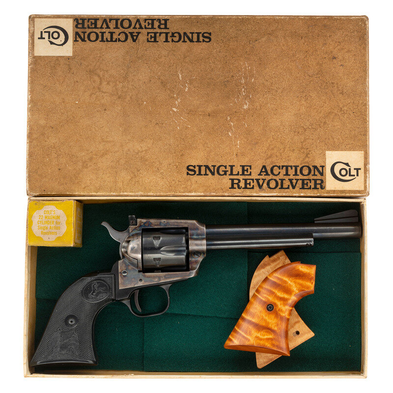 .22LR. 6" barrel. SN: G15249 (mfg. ca. 1971). Blued and color casehardened finish, checkered plastic Rampant Colt logo grips. Single action revolver with loading gate, fluted six-chambered cylinder, adjustable rear sight and serrated ramp front sight. Standard markings. In original factory box with spare .22 Magnum cylinder, a spare set of custom wood grips and factory paperwork. {C&R}