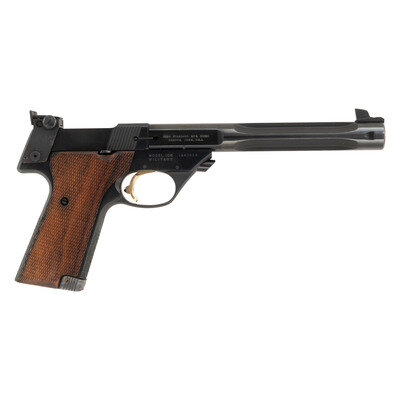 .22LR. 7.25" fluted barrel. SN: 1843819 (mfg. ca. 1966). Blued finish, gold trigger and safety, checkered walnut thumb rest target grips. Semi-automatic push button barrel release target pistol with stippled front strap, fully adjustable rear sight and ramped semi-Patridge front sight. Marked Model 106/Military on left of frame and with Hamden, CT address. Includes a single magazine. In factory box with paperwork. {C&R}