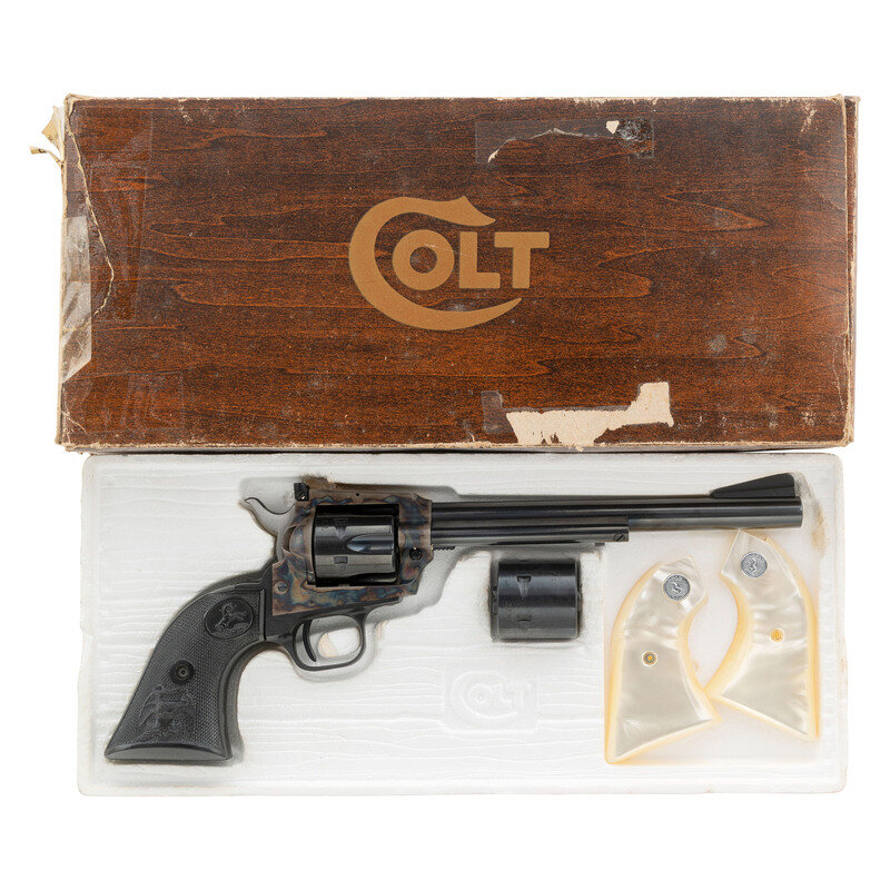 .22LR. 7.5" barrel. SN: G187615 (mfg. ca. 1976). Blued and color casehardened finish, checkered plastic Rampant Colt logo eagle grips. Single action revolver with loading gate, fluted six-chambered cylinder, adjustable rear sight and serrated ramp front sight. Standard markings, including NEW FRONTIER BUNTLINE on left of barrel. In original factory box with spare .22 Magnum cylinder, a spare set of smooth mother of pearl Rampant Colt logo grips and factory paperwork. {MODERN}