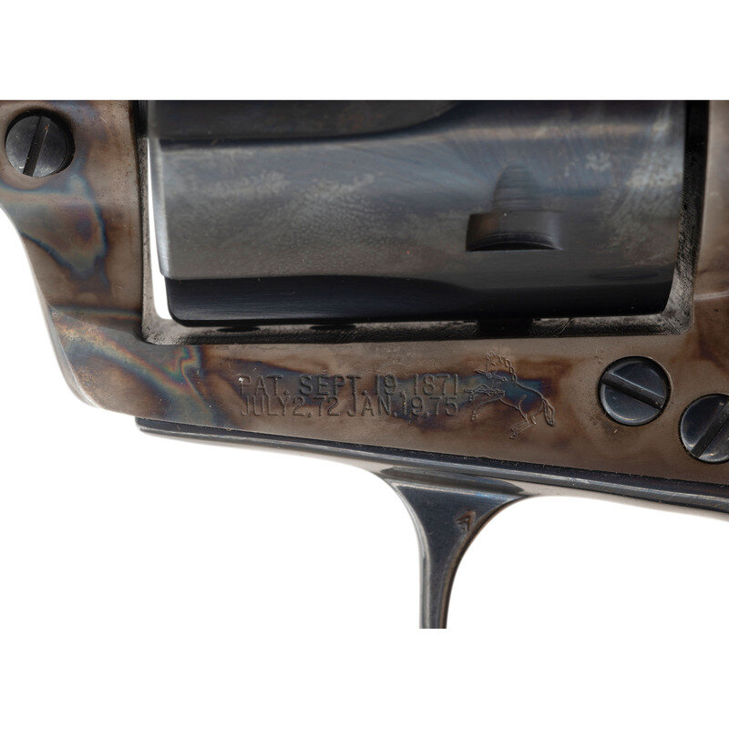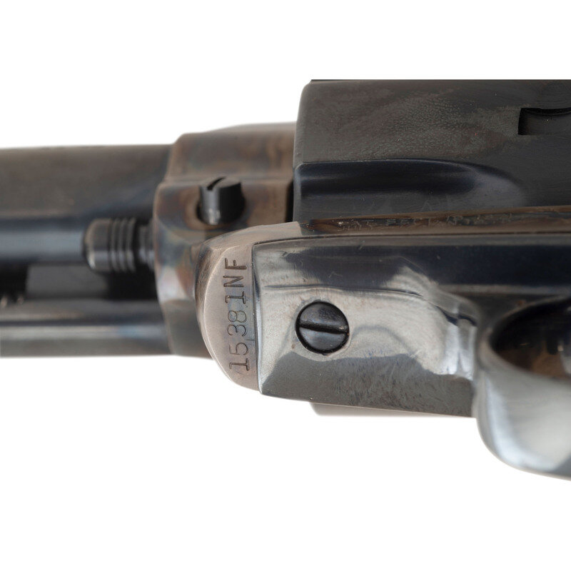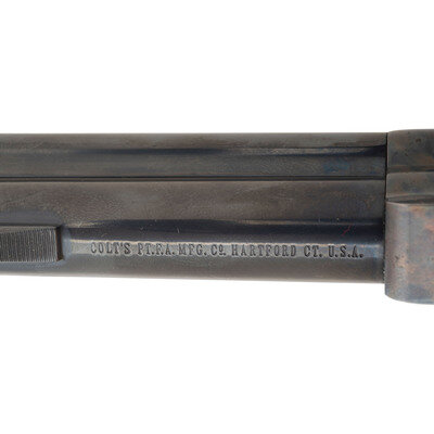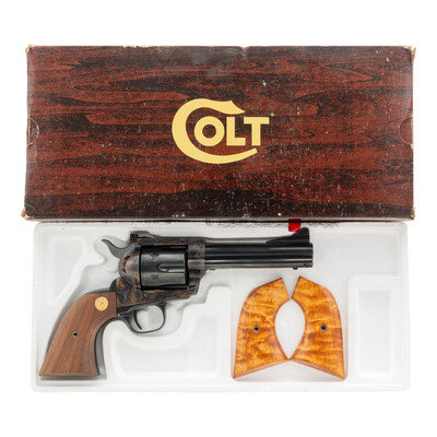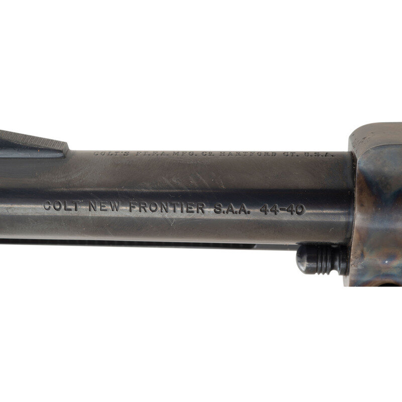 .44-40. 4.75" barrel. SN: 15381NF (mfg. ca. 1981). Blued and color casehardened finish, smooth hardwood Rampant Colt logo grips. Single action revolver with loading gate, fluted six-chambered cylinder, adjustable rear sight and serrated ramp front sight. Standard markings. In original factory box with a spare set of custom wood grips and factory paperwork. {MODERN}
