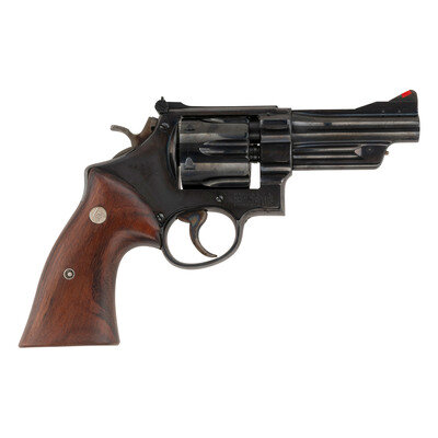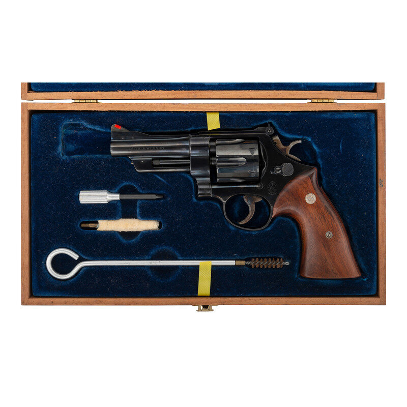 .44 Special. 4" ribbed barrel. SN: S98260 (mfg. ca. 1953-54). Blued finish, color casehardened hammer and trigger, smooth hardwood Smith & Wesson logo medallion grips. Double action 5-screw N-frame hand ejector revolver with six-chambered fluted swing out cylinder, .4" checkered hammer, .3" grooved trigger, adjustable rear sight and serrated ramped front sight with orange insert. Revolver is contained in a Smith & Wesson wood display box with flocked blue plastic form fit interior and includes the cleaning kit and factory paperwork. {C&R}