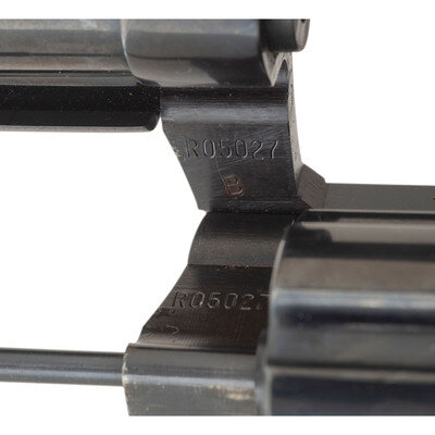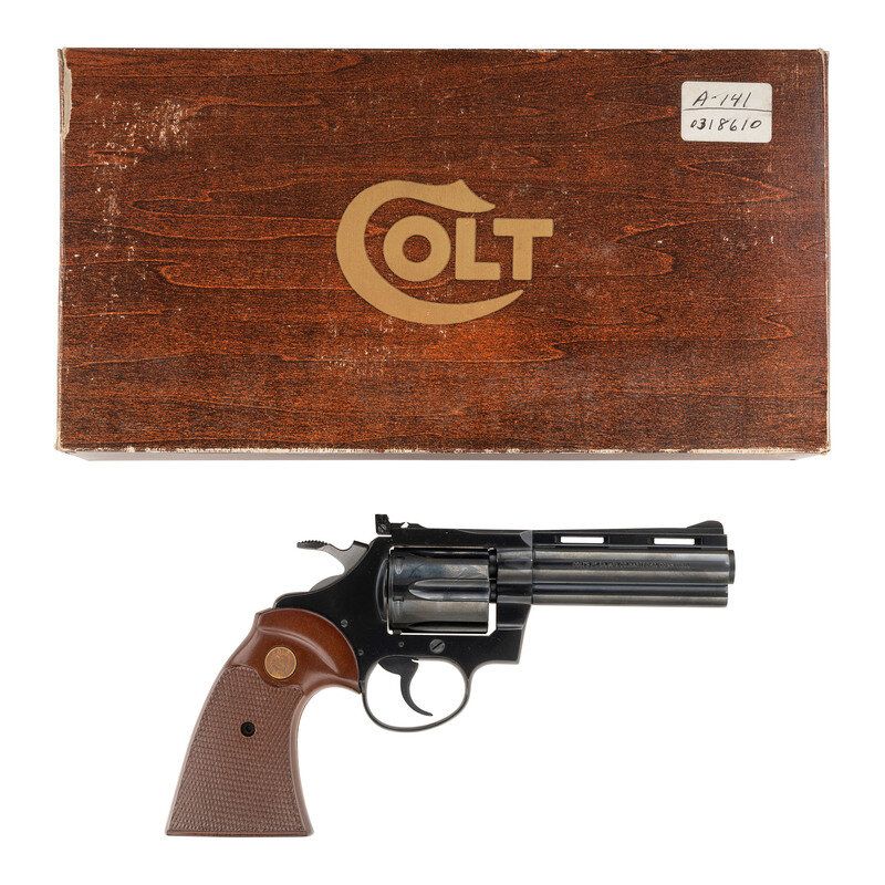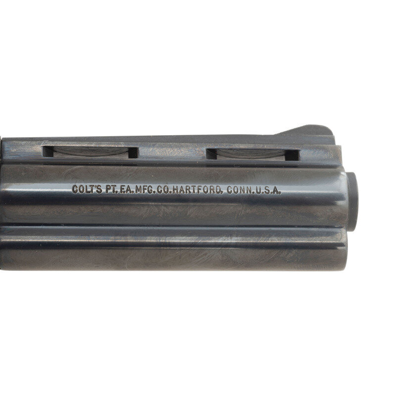 .22LR. 4" ventilated ribbed barrel. SN: R05027 (mfg. ca. 1978). Blued finish, checkered hardwood grips with gold Rampant Colt medallions. Double action revolver with six-chambered fluted swing out cylinder, adjustable rear sight and serrated ramped front sight. Revolver is in the original factory box with wood grain styrofoam insert and wood grain cardboard slip cover. Gold end label matches the gun. Includes factory paperwork. {MODERN}
