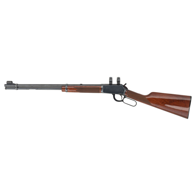 .22 WMR. 20" barrel. SN: F433171. Blued finish, checkered straight grip stock with checkered plastic buttplate, checkered forend. Lever action tubular magazine fed repeating rifle with scope mounts, right side hammer spur extension, elevation adjustable semi-buckhorn rear sight and ramped and hooded front sight. Standard markings. {MODERN}
