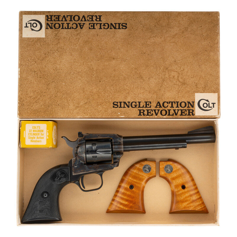 .22LR. 6" barrel. SN: G62691 (mfg. ca. 1972). Blued and color casehardened finish, checkered plastic Rampant Colt logo grips. Single action revolver with loading gate, fluted six-chambered cylinder, adjustable rear sight and serrated ramp front sight. Standard markings. In original factory box with spare .22 Magnum cylinder, a spare set of custom wood grips and factory paperwork. {C&R}