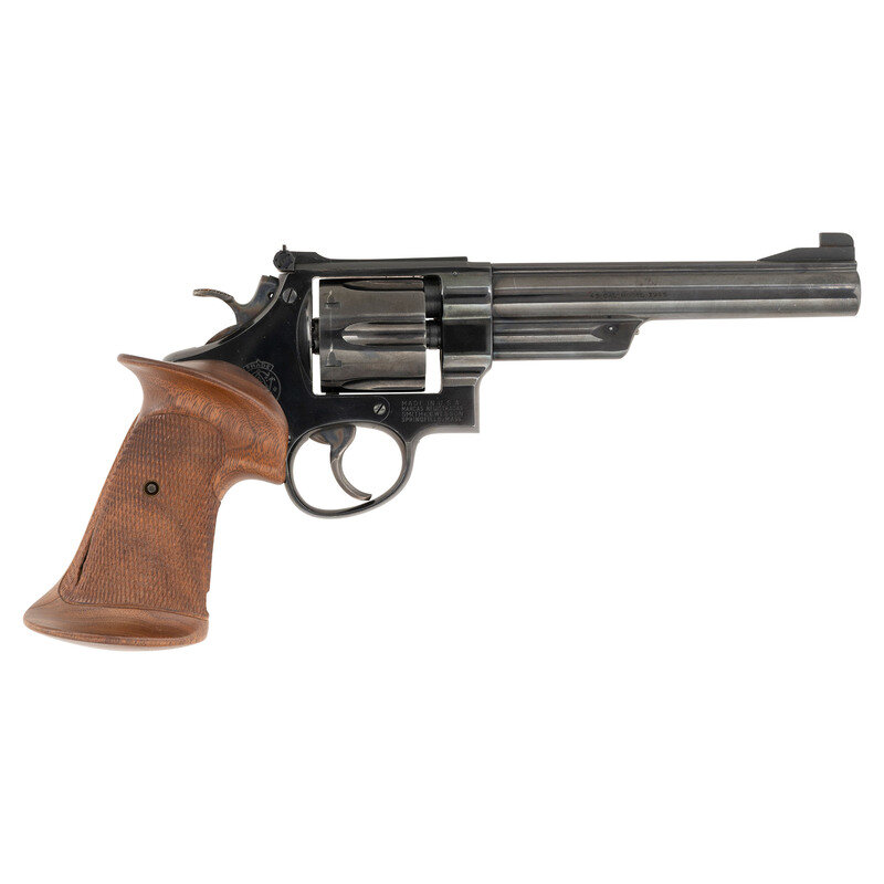 .45 ACP. 6.5" barrel length. SN: S143173. Blued metal finish with case colored hammer and trigger mounting custom thumb rest target grips. Double action six-shot hand ejector revolver featuring a pinned barrel on a five-screw frame. Standard markings include SMITH & WESSON maker mark to left barrel 45 CAL. MODEL 1955 to right, and four-line address to right frame. Sideplate shows Smith & Wesson's monogram trade mark. Topstrap and barrel rib feature a matte blued finish and matting connecting the adjustable rear notch and Patridge front blade sights. Revolver mounts a wide target trigger and hammer. Serial numbers match on the frame, barrel lug, cylinder, and star extractor. {C&R}