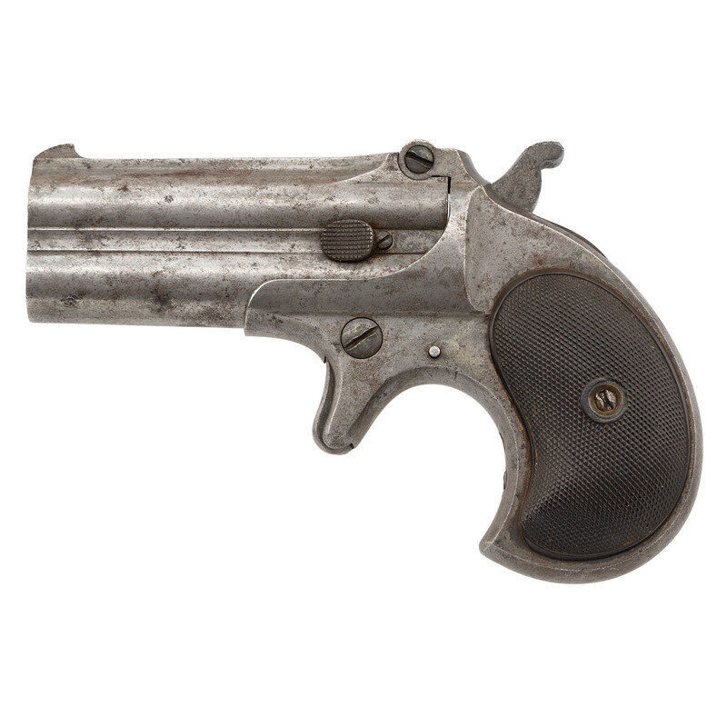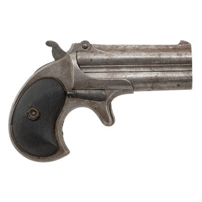 .41RF. 3" barrels. SN: 98. (Mfg ca 1899) Buffed finish overall with checkered hardrubber grips and standard fixed rear notch and front blade sights. Single action over-under derringer pistol with tip-up barrels and manually operated extractor. Barrel rib is signed REMINGTON ARMS C O. ILION, N.Y. {C&R}