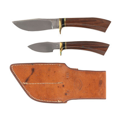 3" and 4.5 blade lengths. 9.75" overall with sheath and hilt. Straight single edged blades with the longer of the two featuring a modified clip point with unsharpened false edge, and the smaller a drop point. Both knives feature brass guard and spacers with hidden tangs set in polished walnut grips, with grip serrations cut into the back of each blade. Larger blade struck BONE/LUBBOCK, TEX. enclosed with the {Bone} log, while the shorter one shows a simplified {Bone} logo without text. Markings to the obverse read U/78.3 on the larger knife and V/78.5 to the smaller, indicating these knives were made after Bone sold his company. Comes with a leather scabbard with loop struck by similar Ralph Bone marking, and includes a honing stone in pouch. Rear side of the loop shows leatherworker mark reading JOHNSON'S LEATHER/CASSELBERRY, FLA.