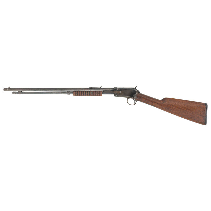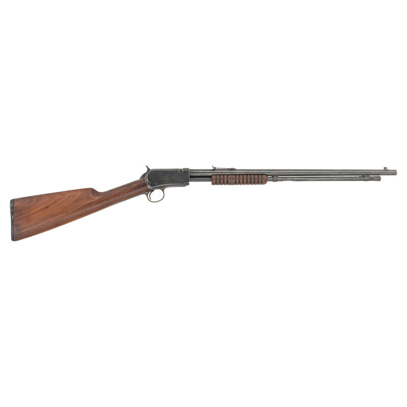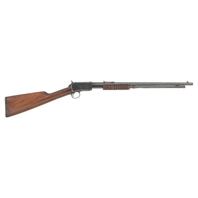 .22 S, L, LR. 20" barrel length. SN: 48232. Blued metal refinish overall with straight wrist walnut stock mounting black synthetic WINCHESTER marked buttplate to shotgun style butt. Slide action repeating rifle featuring elevation adjustable rear V-notch and front blade sights. Standard make and model marks include two-line address and patent mark to left barrel, and three line trademark to upper tang reading -TRADE MARK-/-WINCHESTER-/-REG. U.S. PAT. OFF. & FGN.- Rifle mounts a corncob style forend over a front loaded magazine tube on a takedown frame. {C&R}