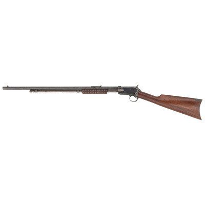 .22 WRF. 24" barrel length. SN: 556935. Blued metal finish with walnut furniture on a takedown frame featuring crescent butt, corncob forend, and an octagonal barrel. Slide action repeating rifle fed by a front loaded magazine tube mounting elevation adjustable rear notch and front blade sights. Upper left barrel flat shows two-line address and patent date reading MANUFACTURED BY THE WINCHESTER REPEATING ARMS CO. NEW HAVEN./CONN. U.S.A. PAT. JUNE 26. 88. DEC. 6. 92. NOV. 27. 06. MAY 30. 1911. followed by MODEL 1890 marking. Three line mark to upper tang reads REG. IN U.S. PAT. OFF./-WINCHESTER-/-TRADE MARK-. Winchester monogram proofs strongly visible to receiver and barrel. {C&R}