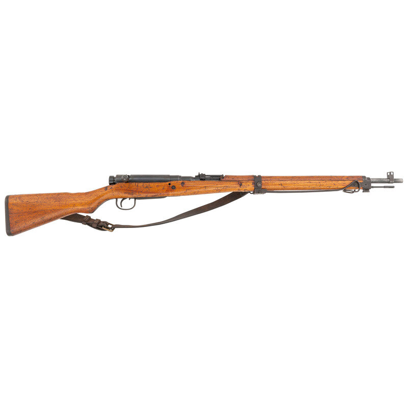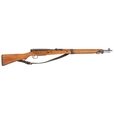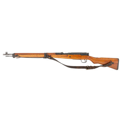 7.7x58mm. 25.9" barrel length. SN: 37851. Blued metal finish overall set in semi pistol grip wood stock with spliced toe, full length upper handguard, and early production accessories. Bolt-action internal magazine fed repeating rifle mounting ladder rear aperture sight with anti-aircraft legs, and barleycorn front blade with protectors. Rifle mounts a folding monopod to the lower barrel band, and a cleaning rod below the barrel. Rifle additionally features a chrome lined bore. Markings include the {Toyo Kogyo} manufacturer marking to left receiver, and {31st Series} mark to the left of the serial number. Standard Type 99 kanji markings to upper receiver below an intact {Imperial Japanese Chrysanthemum}. Item comes with the dustcover, and a leather sling. Serial numbers match on receiver, cocking piece, bolt body, extractor, firing pin, and dustcover. {C&R}