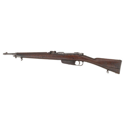 6.5x52mm. 21" barrel length. SN: BC4619. Brown patina overall mounting walnut straight wrist stock with full length upper handguard, bayonet lug to forend cap, and featuring adjustable rear notch and front blade sights. Bolt action repeating rifle fed by an internal magazine charged by en-bloc clips. Manufacture markings to the rear barrel octagonal include circled BL stamp, BRESCIA mark, and a date of 1918. Further BL stamps visible on bolt and cocking piece. {C&R}