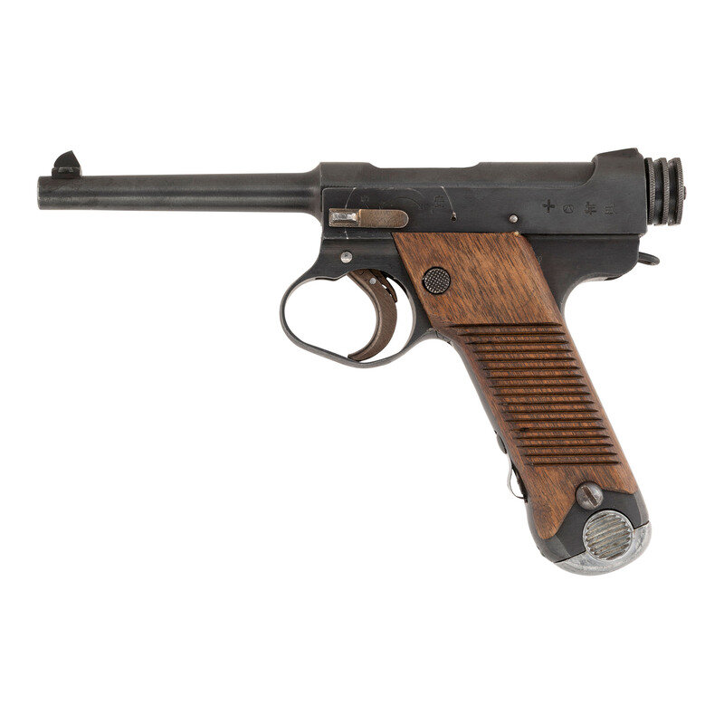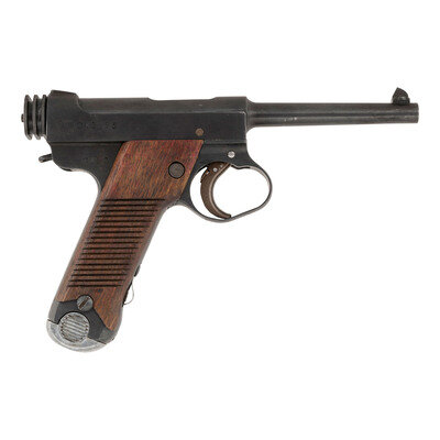 8x22mm Nambu. 4.61" barrel length. SN: 13895. Blued metal finish with straw colored small parts mounting horizontally serrated wood grips, and featuring the large triggerguard and rough wartime finish indicative of later manufacture. Short-recoil operated striker action autoloading pistol fed by detachable single stack magazines. Right frame struck with the production date marking 18.3, indicating it was completed in March, 1943. To the left of the date is the standard mark Sho for Showa, along with a correct weak Na mark below the code. Upper frame displays the Kokobunji manufacturer marking along with a First series mark before the serial number. Standard type and safety marks to left frame. Sights consist of a standard fixed rear notch and front blade. Item shows matching serial numbers where visible on all parts, and non numbered firing pin and firing pin spring guide. The serial number is written to the interior of each grip panel in pencil. Magazine also features a matching serial number. It is estimated that 20,300 of the 277,000 Type 14 pistols produced were of the Kokobunji First Series, or 7.3% of total production, making this an unusually high condition version of a scarce pistol. {C&R}