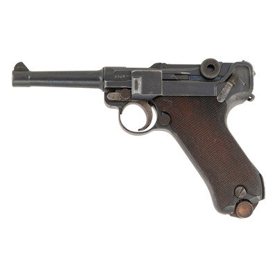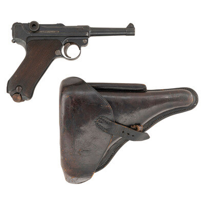 9mm Para. 3.9" barrel length. SN: 2387d. Blued metal finish overall with nitre blued and straw colored small parts mounting checkered walnut stocks. Short-recoil operated striker action autoloading pistol using the toggle locking principle and fed by detachable single stack magazines. Toggle link shows the DWM mark of Deutschewaffen und Munitionsfabriken with a date mark to the forward slide of 1916. Barrel exhibits a bore gauge mark of 8,83, and the right slide shows the WWI Imperial German {Reichsadler} stamp beside three Gothic letter inspection stamps. Further {Reichsadler} marks appear on the upper barrel and left breechblock. Shows standard GESICHERT safety marking to left frame and GELADEN loaded chamber mark to left extractor. Majority of serial numbers match, but the pistol mounts a replaced nonfluted firing pin. Grips match. Magazine is the period correct wood base plug model but does not match the pistol. Comes in a leather Luger pattern holster with maker mark reading C. HOLSTE & CO/MUNCHEN/1916, a Bavarian leather goods maker that produced holsters for Imperial Germany in World War I. Holster contains a Luger disassembly tool with a weak WWII {Droop Wing Eagle} stamp. {C&R}