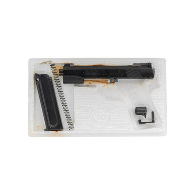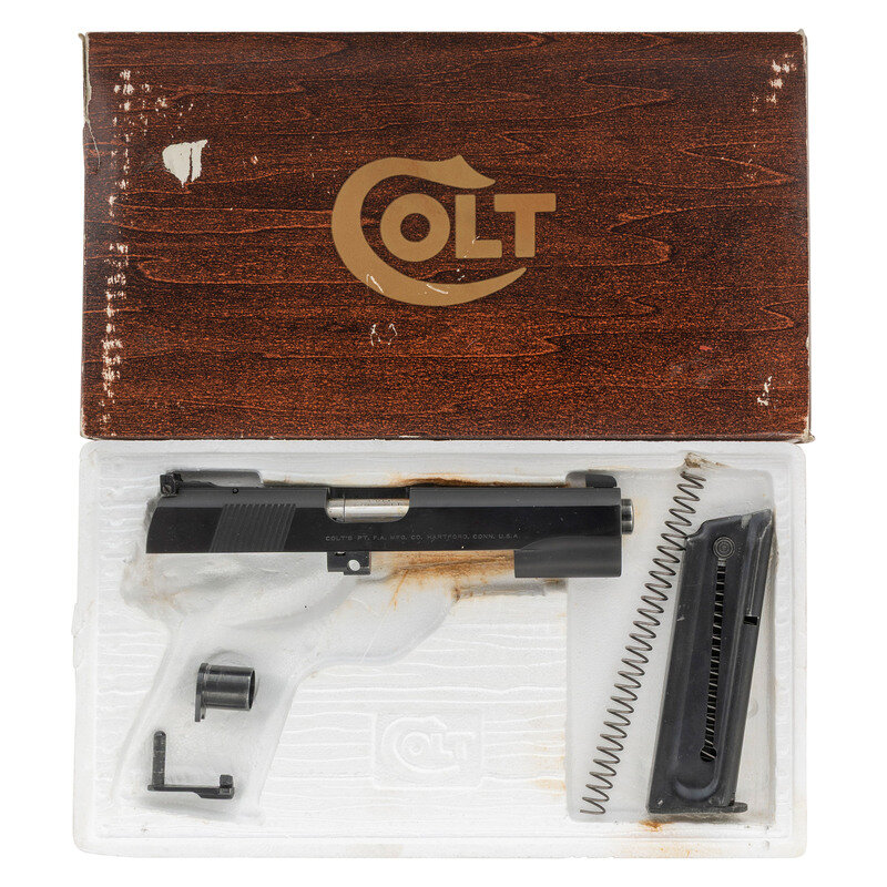 Colt factory .22 LR conversion unit for 5" 1911 and 1911A1 pistol frames with floating chamber and Accro adjustable rear sight. Includes complete blued slide unit with barrel, barrel bushing, slide stop, recoil spring and magazine. In factory styrofoam box with instructions and Colt wood grain cardboard slip cover.
