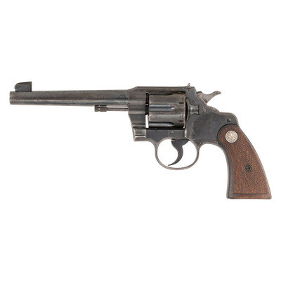.38 Special. 6" barrel. SN: 625239 (mfg. ca. 1950). Blued finish, hammer flats polished bright, checkered walnut Rampant Colt medallion grips. Double action revolver with six-chambered fluted swing out cylinder, windage adjustable rear sight and pinned blade front sight. Two line barrel address and patent markings with 1884, 1905 and 1926 dates. Left of barrel marked in two lines: +OFFICERS MODEL 38+ over +HEAVY BARREL+. Rampant Colt on left rear of frame. Matching serial numbers on interior of frame and crane, grips not numbered. {C&R}