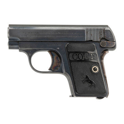 .25 ACP. 2" barrel. SN: 319620 (mfg. ca. 1922). Blued finish, color casehardened trigger and grip safety, checkered plastic Rampant Colt logo grips. Semi-automatic detachable magazine fed blowback operated pistol with grip safety, thumb safety and slide groove sight. Standard markings. Includes a single two-tone magazine. {C&R}