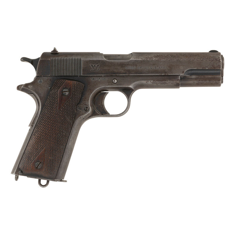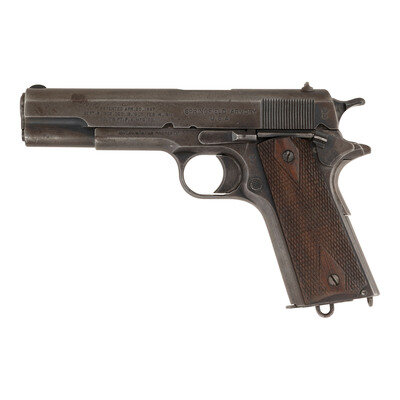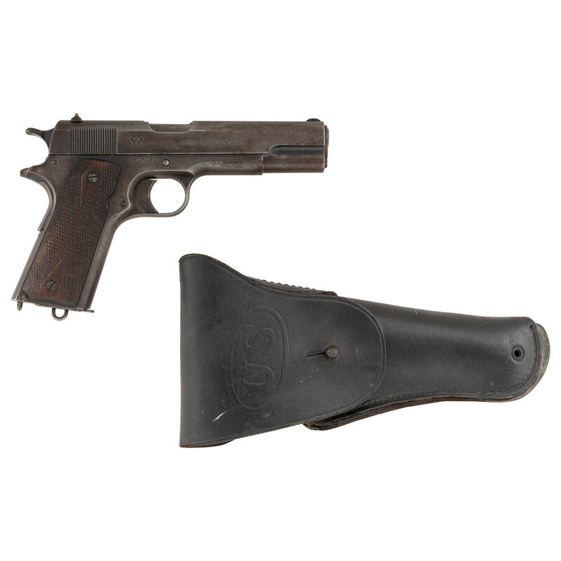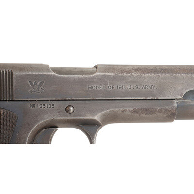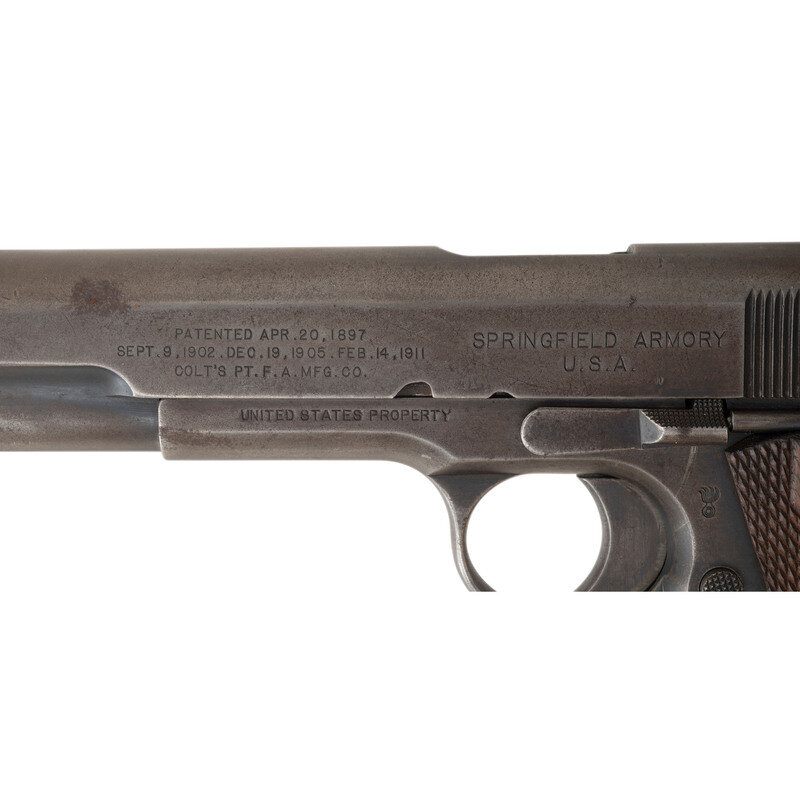 .45 ACP. 5" barrel length. SN: 105105. Blued metal finish mounting diamond checkered walnut grips and military pattern rear notch and front blade sights. Short-recoil operated single action autoloading pistol fed by detachable single stack magazines manufactured by Springfield Armory during World War I. Left slide struck with the two-line SPRINGFIELD ARMORY/U.S.A. manufacturer mark forward of the cocking serrations and the {Ordnance Bomb} logo behind. Three line address and patent information to left slide reads PATENTED APR. 20. 1897/SEPT. 9. 1902. DEC. 19. 1905. FEB. 14. 1911/COLT'S PT. F.A. MFG. CO. Right slide displays the US Army {Spread Winged Eagle} followed by MODEL OF 1911. U.S. ARMY. Left dustcover is marked UNITED STATES PROPERTY and the frame shows an additional {Ordnance Bomb} mark. Item shows the Springfield Armory S stamp to various subcomponents including the barrel, hammer, extractor, and slide stop. No S logo to bushing suggests it may have been replaced. Magazine shows a two-tone finish and lanyard loop to the floorplate. Comes with a Vietnam era pattern 1916 leather holster showing maker marking BOLEN LEA. PROD./7791466. {C&R}