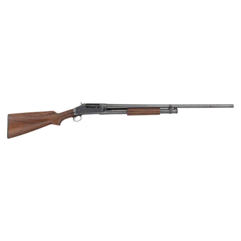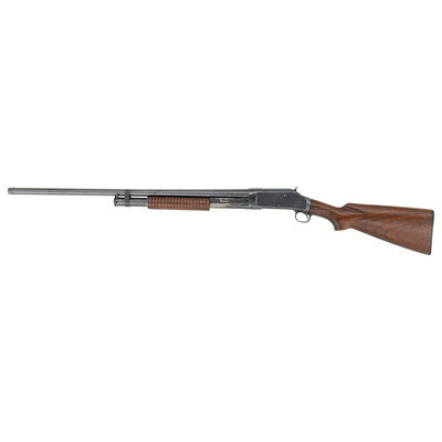 16 Gauge. 28" barrel length. SN: E964300. 2.75" chamber length. Modified Choke. Blued metal finish mounting walnut semi-pistol grip stock with corncob forend, brass bead front sight, and WINCHESTER marked black synthetic buttplate. Slide action repeating shotgun fed by a half length tube magazine on a takedown frame. Standard make and model markings overall including MODEL 97 mark, and FULL choke marking. Choke currently measures at Modified, suggesting wear. {C&R}