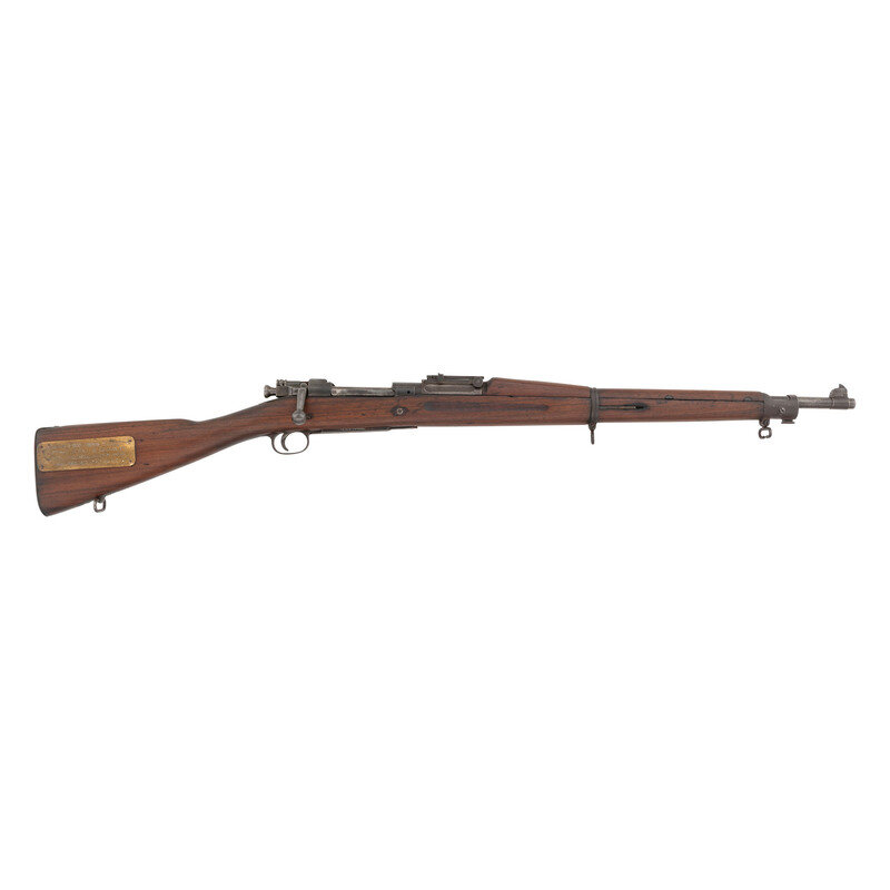 .30-06. 24" barrel length. SN: 897257. Parkerized metal finish overall set in a walnut straight wrist stock with full length upper handguard and mounting adjustable rear ladder and front blade sights. Bolt action internal magazine fed repeating rifle charged with stripper clips. The receiver is marked U.S./SPRINGFIELD/ARMORY/MODEL 1903 with the serial number corresponding to an original production date of 1918. Item was rebarreled with the currently mounted example marked SA/{Ordnance Bomb}/8-38, indicating it was made in August of 1938. Barrel shows importer markings partially obscured by the bayonet lug. Stock shows no visible cartouches or circle P mark, and has been sanded. Right butt fitted with a brass plate reading SPRINGFIELD 1903 SERIAL NO. 897257/CAPTURED AT FALL OF BATAAN PI./9 APRIL 1942 RECOVERED IN JAPAN/APRIL 1991. RETURNED TO U.S. No further paperwork affirming this attribution is available. {C&R}