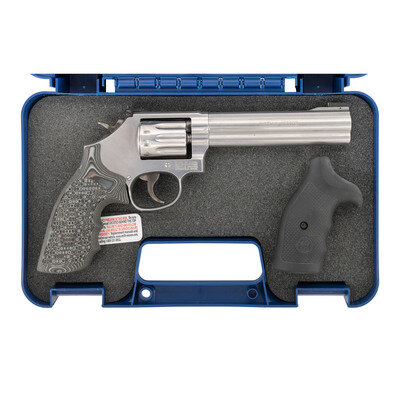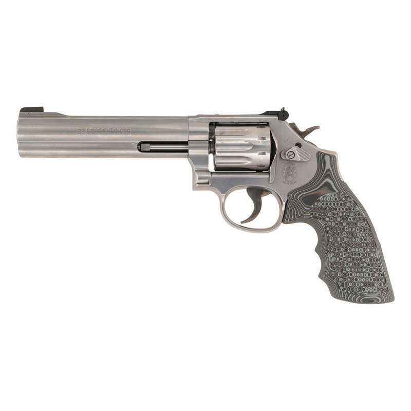 .22 LR. 6" barrel length. SN: CZF7099. Brushed stainless steel finish with matte finished upper barrel and topstrap mounting casehardened hammer and trigger, and scalloped G10 synthetic grips. Double action ten-shot hand ejector revolver mounting adjustable target rear notch and pinned front blade sights. Item features a full length underlug, heavy barrel, and an internal safety lock. Standard make and model markings including four-line address to the right frame and Smith & Wesson trademark to the left. The sights have been touched up with hand applied white enamel paint with the front sight additionally highlighted by a green dot likely applied with marker. Item comes in a matching blue synthetic hard case with: cable lock in package, owner's manual with inserts, two internal safety lock keys, and the original Smith & Wesson logo black rubber grips. {MODERN}