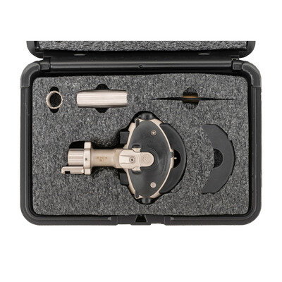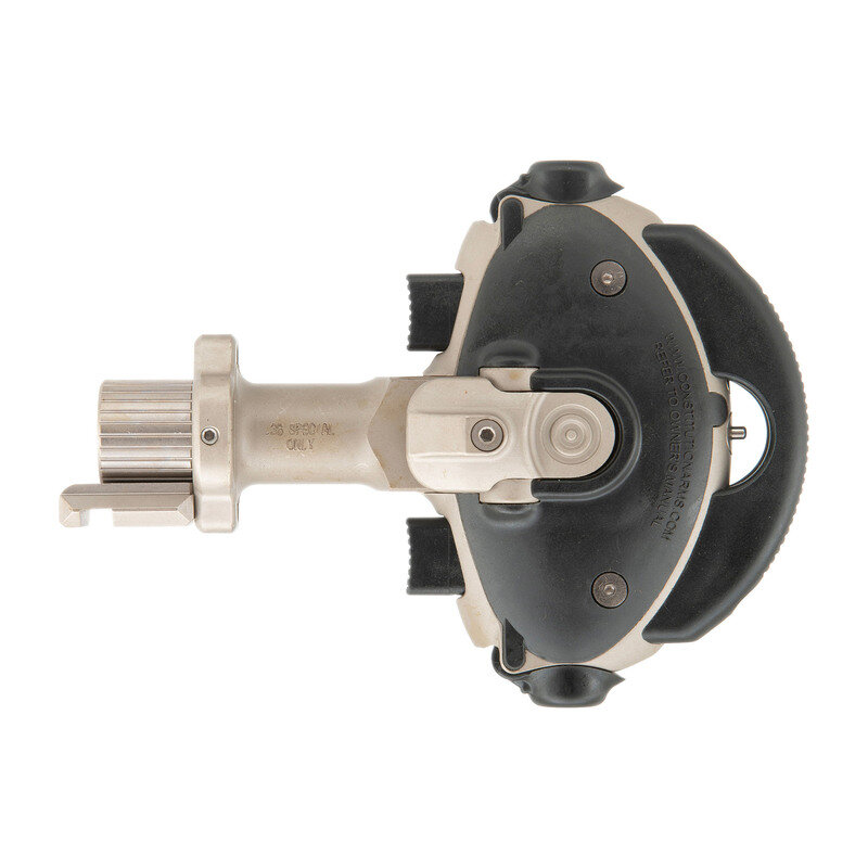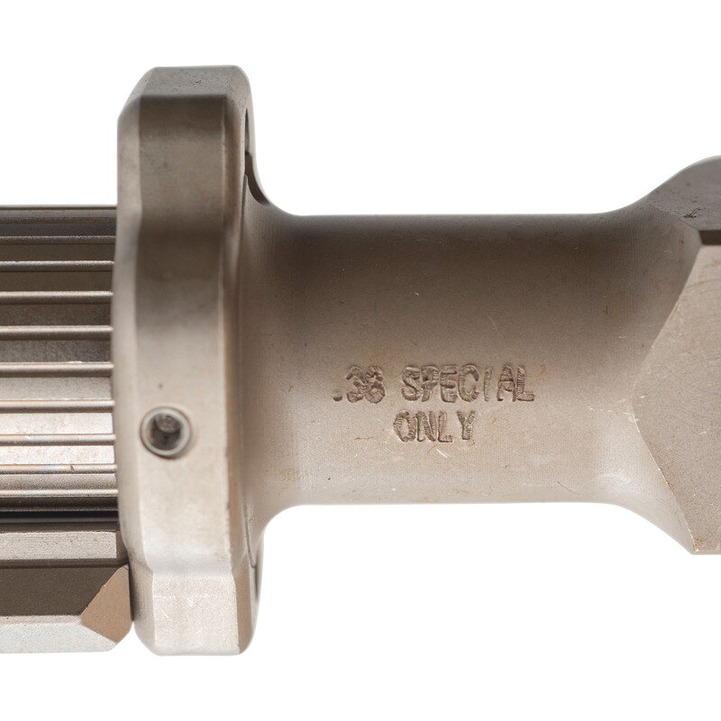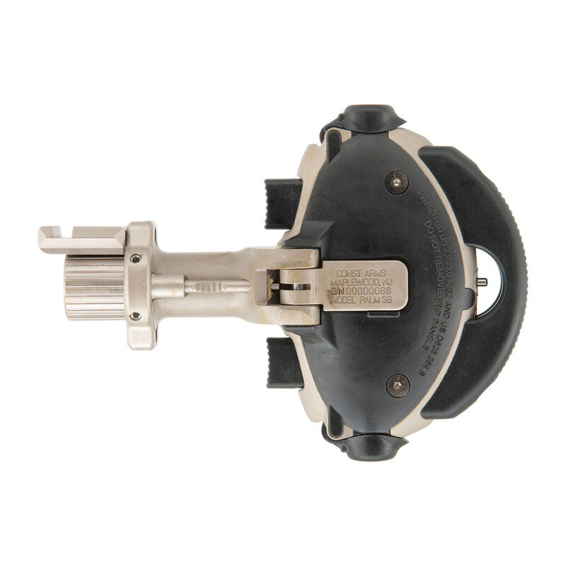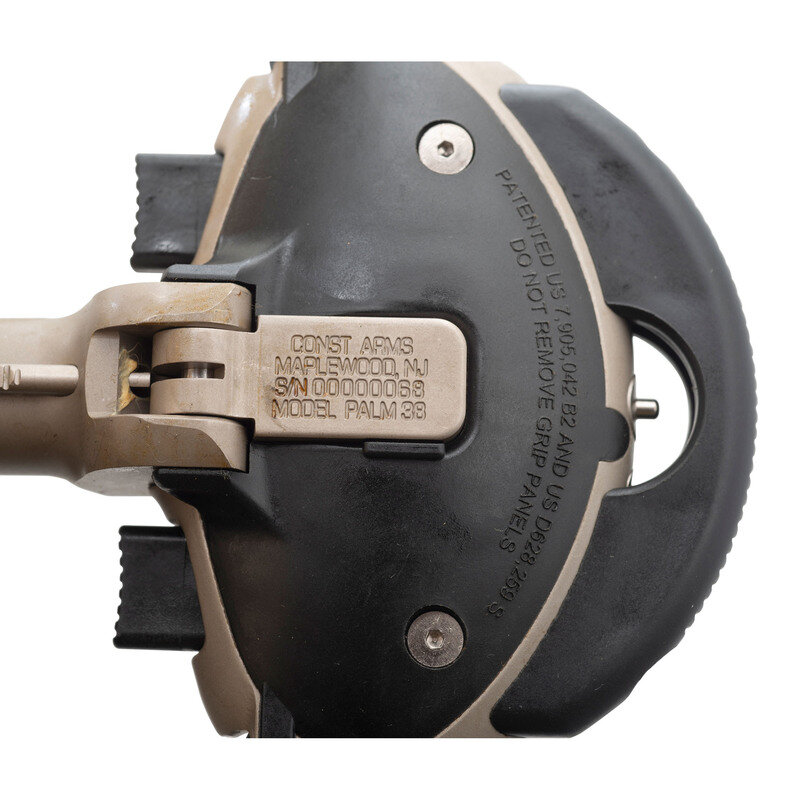 .38 Special. 0.5" barrel. SN: 00000046. Matte stainless metal, polymer furniture and palm rest. Single shot, swivel barrel palm pistol with double grip safeties, push button triggers and Picatinny rail for light or laser. Advertised as the "World's First Production Handgun for the Disabled", the inventor also tried to get the unique design qualified with the FDA as a medical device, which failed. Intended for use for those who cannot operate a conventional handgun, the pistol features push button triggers on both the top and bottom allowing for firing by either the thumb or even pinkie finger. Additional options included a screw on 2" barrel extension shroud for the externally threaded .5" barrel, a screw on "strike bezel" which added serrated teeth at the muzzle to create an impact weapon and the Picatinny accessory rail attached to this gun. The pistol is as new in box with all of the above mentioned accessories, a second size polymer back strap, factory paperwork, Allen wrench to attach and remove the rail and back strap, a fired cartridge case. Made in very small numbers, these are a unique and very modern take on the classic "palm pistol" concept. {MODERN}