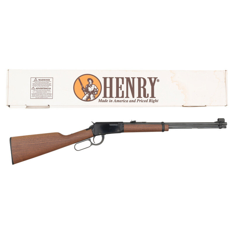 .22 LR. 18.5" barrel length. SN: 095985. Blued metal finish with painted finish to the receiver mounting walnut straight wrist stock and black synthetic shotgun style butt. Lever action repeating rifle fed by a full length magazine that is frontally charged. Sights consist of an adjustable rear notch and fully hooded front bead sights. Standard make and model markings. Item comes in its original cardboard shipping box with the owner's manual and a cable lock in its package. {MODERN}