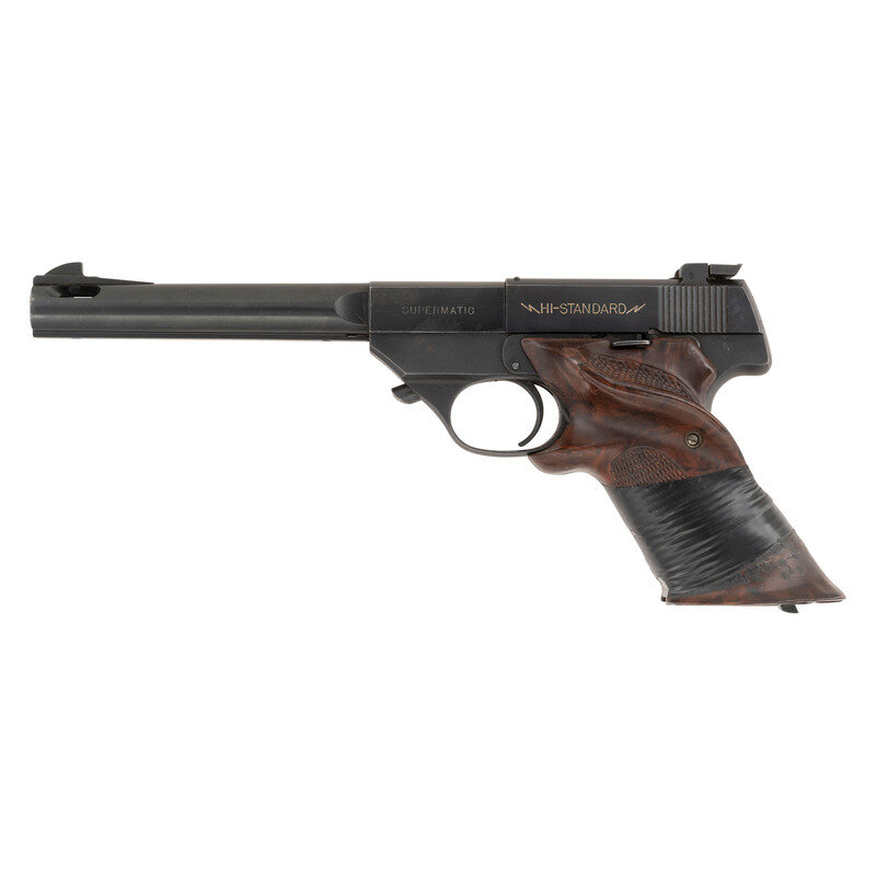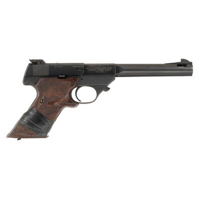 .22LR. 6.75" ported barrel. SN: 489904 (mfg. ca. 1954). Blued finish, checkered thumb rest target grips. Single action semi-automatic target pistol with push-button removable barrel, thumb safety, slide lock and release lever, adjustable rear sight and ramped front sight blade. Includes a single magazine. {C&R}