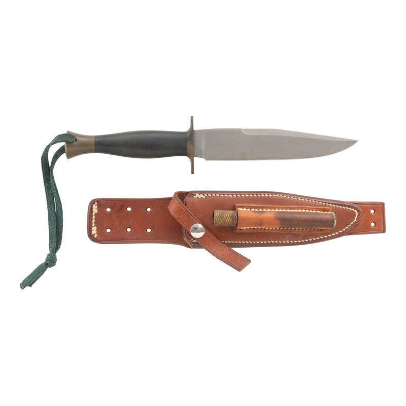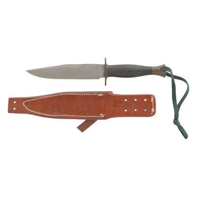 6" clip point single edged blade with .5" choil, 1.17" wide at widest point. 10.5" in overall length, with a 4.5" hilt. 2.25" oval brass cross guard, 1" flared brass pommel cap. Oval cross section black Micarta grip with palm swell. This exact model has not been located in various sources regarding Lile's knives and appears to combine the blade form of his Grey Ghost knives with the hilt of his Arkansas toothpick style dagger. Reverse ricasso stamped LILE without a "dot" over the "I". Includes a Johnson Sheathery marked leather sheath with sharpening steel. A nearly identical pattern knife was offered for auction with a 9" blade and was noted to have been a "prototype" for the Rambo "First Blood" knife, but no provenance or evidence was offered.