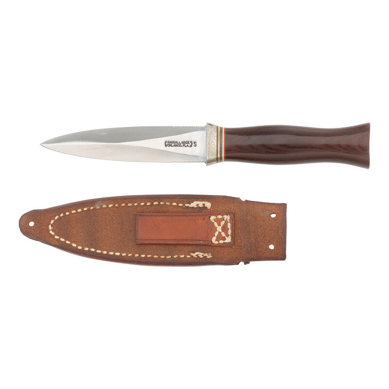 4" double edged spear point blade with .75" of grooved thumb notches along the upper and lower rear edges, forward of the bolster. A median ridge runs about half the length of the blade. Blade .88" wide at ricasso and marked on the flat in two lines: {RANDALL MADE/ORLANDO, FLA} followed by an S. 7.875" in overall length with 3.875" hilt and 3.675" brown Miacarta flat, palm swell grip with flat pommel. Nickel silver booster at blade junction with red, cream and black spacers. Includes a leather Randall concealment sheath marked 24.