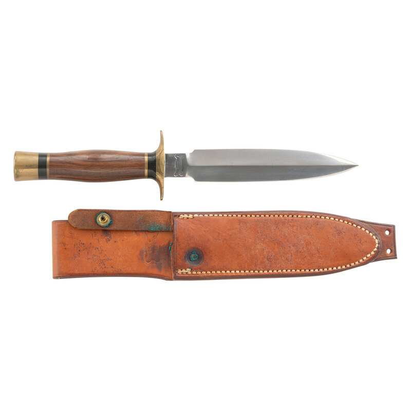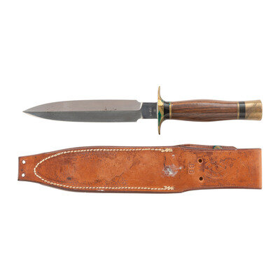 6" double edged spear point blade with prominent median ridge, blade 1" wide at widest point. 10.5" in overall length with a 4.5" hilt with a slightly curved 2.25" oval brass guard and a 1" brass pommel cap. Oval cross section hardwood grip with moderate palm swell and black synthetic spacers. Obverse ricssso marked with BONE/LUBBOCK, TEX. within the outline of a bone. Includes a Bone marked leather sheath.