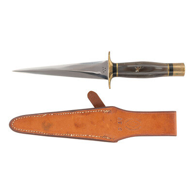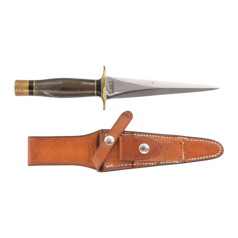 6" blade length. 11.5" overall with sheath and hilt. Straight double edged needle point dagger blade with brass guard featuring hidden tang construction, brass pommel, and brass and black synthetic spacers enclosing horn handle grips. Blade is struck BONE/LUBBOCK, TEX. enclosed with the {Bone} logo. Model mark to obverse reads AT/78.7, indicating this knife was produced after Bone sold his company. Comes with a leather scabbard with loop struck by similar Ralph Bone marking, and includes a honing stone in pouch.