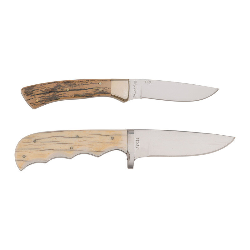 1) 3.325" drop point single edged blade 7.5" in overall length. Reverse ricasso with WEINAND/LALO, MT mark at ricasso. Obverse ricasso marked Mastadon and blade marked 440. Smooth Mastadon tusk grip scales.