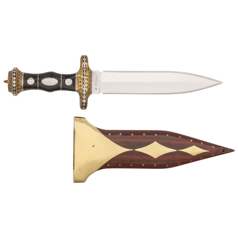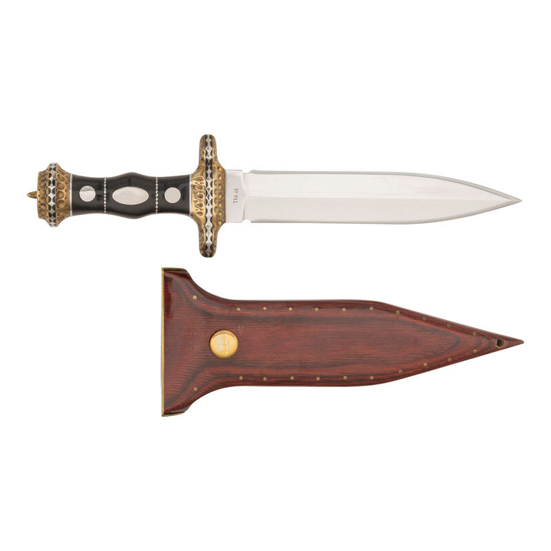 8.5" blade length. 14" with hilt. 15.6" with hilt and scabbard. Straight double edged spearpoint tipped blade with medial ridge and a hidden tang hilt with brass and alloy quillons. Ricasso is struck BY HILL on one side with model marking PERSUADER on the reverse. Grips are composed of dark hardwood with brass and alloy spacers, the latter with black enamel border. Oval plates fitted to wood sections, and scalloped design engraved in the elements of the guard and pommel. Item comes with a laminated wood scabbard lined in leather with a brass encased throat, brass diamond embellishments to obverse side, and fasteners along the edges.
